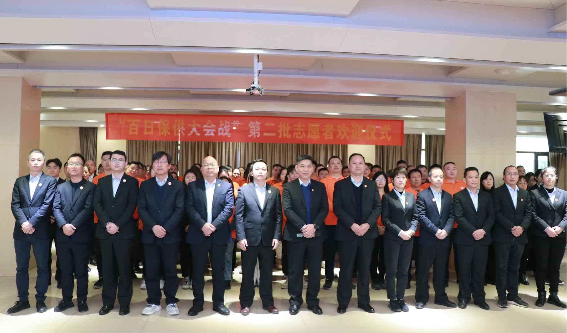 伴随着挥舞的旗帜,“百日保供,营销有我”的口号响彻会场。一句誓言,一面旗帜,一份使命,一种责任。当第二批志愿者海南组组长童元兵接过刘景萍董事长授予的旗帜时,也接过了保供生产沉甸甸的使命与责任。